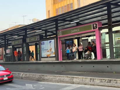 Boarding platform designed for women and people with disabilities only (left) and women-only sections on the BRT buses in Mexico City